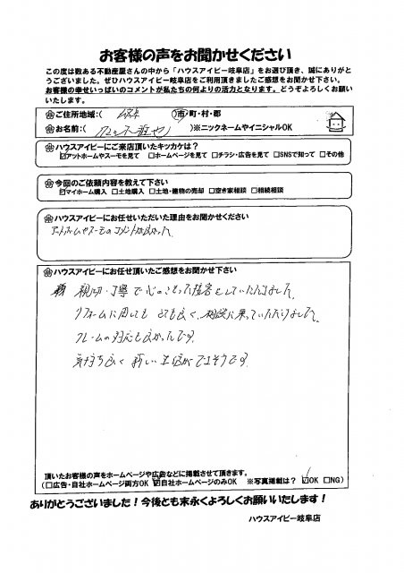 この度はハウスアイビーでお家をご購入頂き誠にありがとうございます。 リフォームの際、ご迷惑をおかけして申し訳ありません。色々とご理解いただき本当にありがとうございます。お家をお引渡ししたこれからが、本当のお付き合いだと思っております。 何かございましたらいつでもご連絡ください。 これからも末永くよろしくお願いします。
