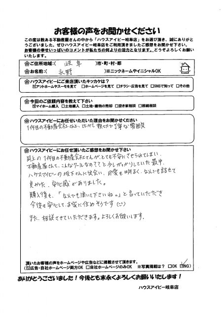 永野様、ありがとうございます。お家の考え方、資金計画のビジョンなど本当によく考えておられて、私もすごく勉強になりました。お二人とも気さくにお話をして頂けましたので、ご案内していて私もとても楽しかったです。 これからも何かお困りごとがございましたら、いつでもお気軽にご連絡下さい!