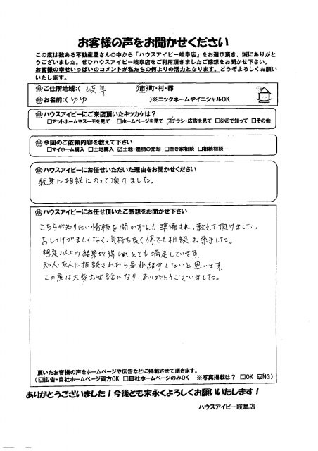 こちらが知りたい情報を聞かずとも準備され教えて頂けました。 おしつけがましくなく、気持ちよく何でも相談できました。 想像以上の(売却)結果が得られ、とても満足しています。 知人・友人に相談されたら是非紹介したいと思います。 この度は大変お世話になり、ありがとうございました。