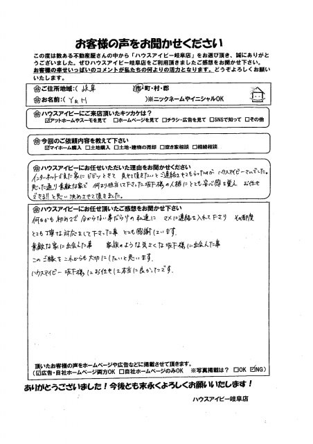 Y&H様、こちらこそありがとうございました。 他県からのお引越しで、ご不安なことや戸惑うことも多いかと思いますが、どんなことでもお困りごとがあれば、いつでもご連絡下さい。 素敵なお家で、楽しい暮らしが想像できて、私もまたお邪魔するのを楽しみにしています! 今後ともどうぞよろしくお願いいたします!