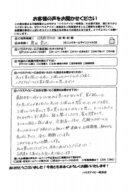 ネットで家を探しているときに、三浦さんのコメントのページを見て、ハウスアイビーさんで家を探したいと思いました。