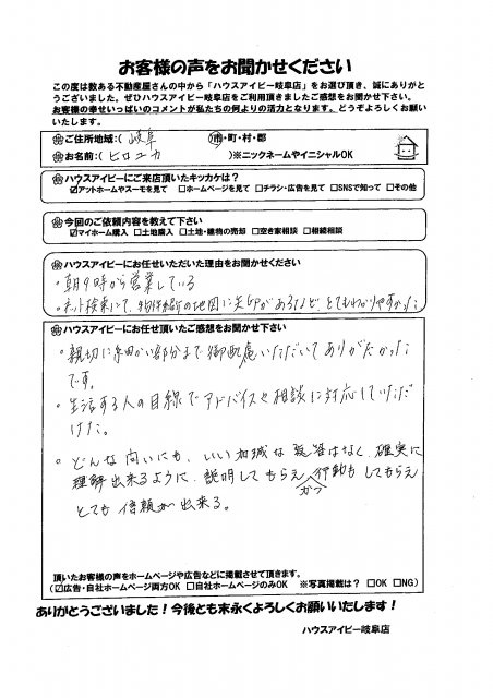 ヒロユカ様 この度は数ある不動産屋さんの中からハウスアイビー岐阜店をお選びいただき、誠にありがとうございます。 また、身に余るコメントいただき、大変うれしく思います。 お会いするたびにこちらこそいつもお気遣いいただきありがとうございます。 とても仲の良いご夫婦でお会いしてお話しして、私がいつもパワーを貰っておりました。 お家は引き渡してからが本当のお付き合いの始まりです。 これからの何かご心配事ございましたら、何なりとお申し付けください。