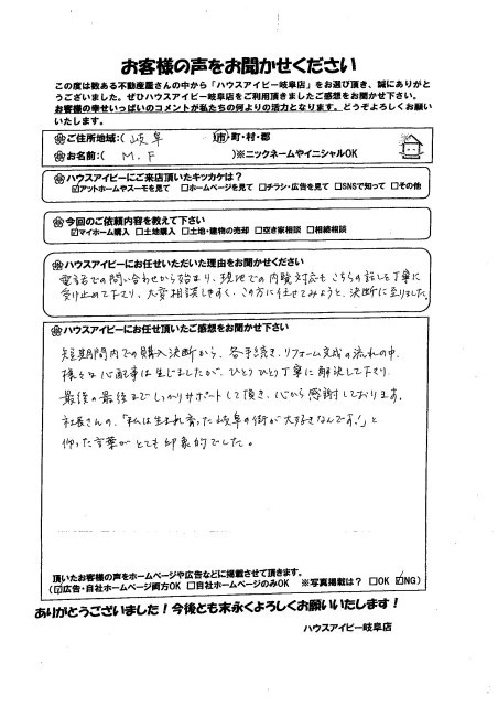 電話での問い合わせから始まり、現地での内覧対応もこちらの話を丁寧に受け止めて下さり、大変相談しやすく、この方に任せてみようと決断に至りました。 短期間内での購入決断から、各手続き、リフォーム完成の流れの中様々な心配事は生じましたが、ひとつひとつ丁寧に解決して下さり、最後の最後までしっかりとサポートして頂き、心から感謝しております。 社長さんの「私は生まれ育った岐阜の街が大好きなんです!」と仰った言葉がとても印象的でした。